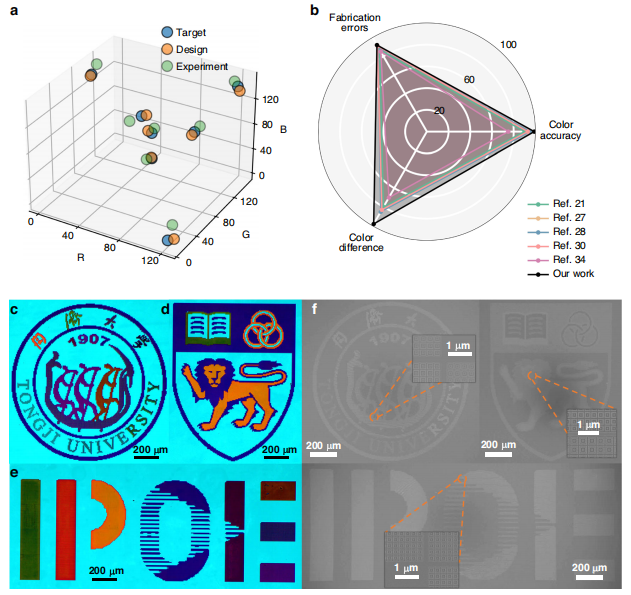 在方形环-柱复合结构的实验中,MPSN在测试集上实现了99.9%的预测精度,平均绝对误差低于0.002。与混合密度网络、串联网络、变分自编码器及条件生成对抗网络相比,MPSN在均方误差收敛速度、预测一致性与结构多样性方面均表现最佳。研究团队还通过电子束光刻制备了16色色卡及三所机构徽标的结构色图像,实验测量结果与设计目标高度一致,RGB误差小于10,单像素尺寸仅为6.7微米,色彩分辨率优于传统三单元分立设计。