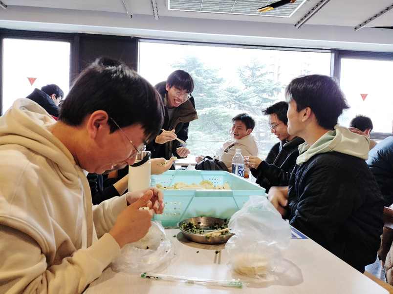 来自五湖四海的同学们在餐桌上各显神通。有的同学手法娴熟,捏出的褶子工整漂亮,透着一股“专业范儿”;有的同学则发挥了物理人的想象力与创造力,包出的饺子形态各异,妙趣横生。大家平日里或许埋首于公式与实验,此刻却都表现得格外随和。面粉沾在手上,笑容挂在脸上,大家一边包饺子,一边畅所欲言,没有了拘谨,只有此起彼伏的欢声笑语。